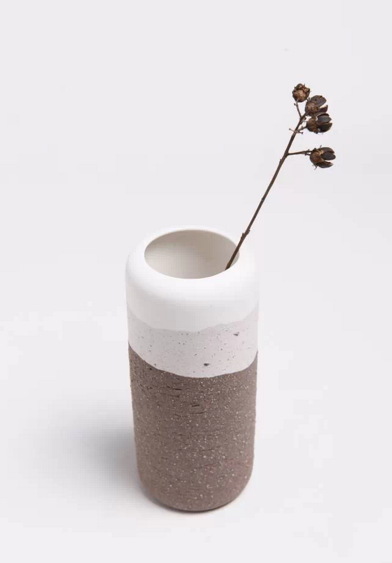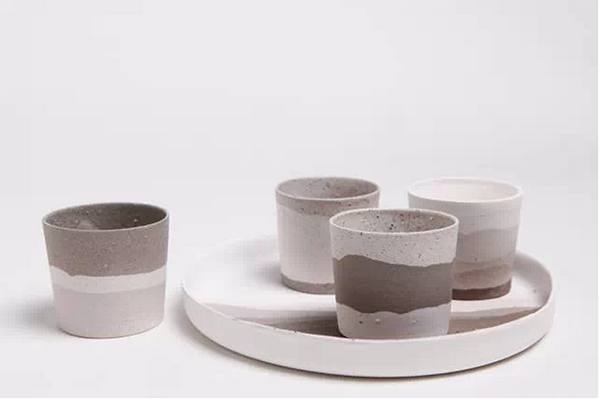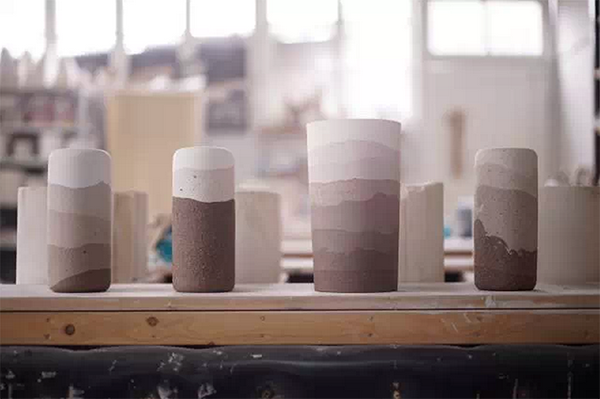 灌浆是一个便于快速制作和大批量生产的陶瓷工艺。耳语这次选择用不同种类或色泽的土,在灌浆过程中,至下而上逐层灌浆,像是潮水般的涨退与覆盖,或是地层的累积与融合,将他们凝固在同一个物体上,使得在同一物体上同时呈现出不同地域和纯度的土质,因此,在同一个容器中,我们可以感受到从宜兴黑紫砂土到景德镇高白泥的融合。同时,原本快速的“灌浆”动作变的缓慢而具有仪式感,泥浆在缓慢的转动中附着成型。如此反复数次完成一个容器。