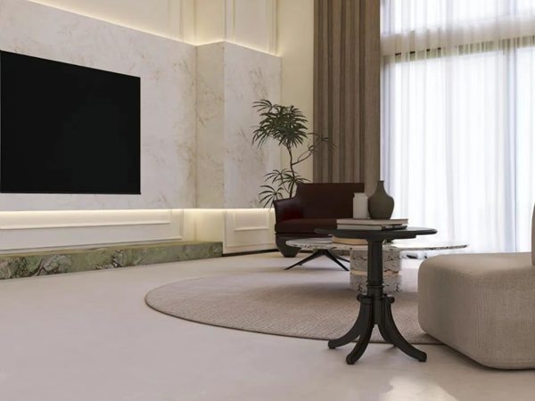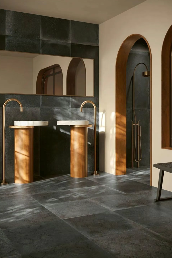 「斐波系列」800x1350黄金比例规格,让空间在视觉上自然延伸,结合无限任意连纹设计,营造出开阔而不空旷的完美尺度。搭配亮哑面组合配套,无论是客厅的背景墙,还是卫生间的干湿分区,都能创造出恰到好处的空间韵律。