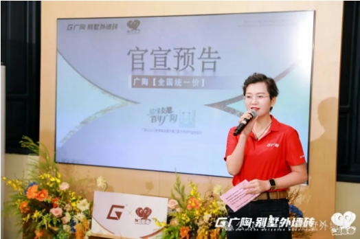 鉴赏环节结束后,主持人随即引出广陶“诚信经营、品质至上”的理念,邀请广宁广陶陶瓷有限公司营销副总经理姚妙英女士登台正式揭晓“全国统一价”重磅预告。此次推出的“全国统一价”机制,是广陶持续强化品牌高端定位,传递品牌公信力的的重要举措,将在10月1日国庆节,通过线下户外大牌、线上新媒体全平台和全国服务商门店三位一体,形成海陆空全覆盖、超声量的广陶【全国统一价】正式官宣。