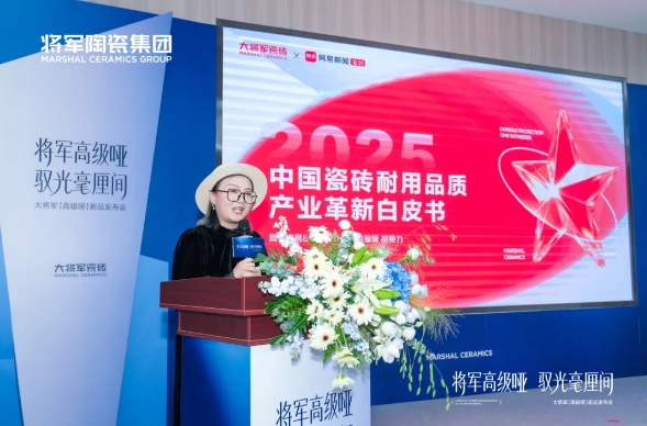作为大会的另一高光时刻,网易家居、网易设计全国总编辑胡艳力正式发布《2025中国瓷砖耐用品质产业革新白皮书》。该白皮书由大将军瓷砖联合权威媒体与专业研究机构共同编撰,是行业首部聚焦“耐用”价值的系统性产业指南。她强调,耐用不仅是产品性能的体现,更应成为品牌价值的核心维度。这份白皮书立足当下、面向未来,不仅总结了当前技术成果,更为行业树立了可衡量、可追溯、可信赖的品质新标尺。
