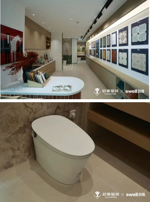 此次展厅呈现,冠军磁砖联合四维卫浴,