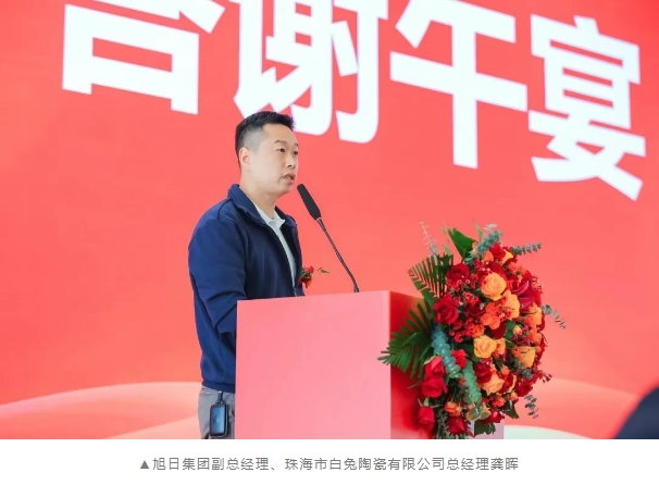 在答谢午宴上,旭日集团副总经理、珠海市白兔陶瓷有限公司总经理龚晖发表致辞,向长期以来给予支持的各方致以诚挚谢意。随后,旭日集团高层领导团队与现场来宾共同举杯,齐贺旭日集团28号窑绿色智能生产线顺利投产这一意义非凡的美好时刻。