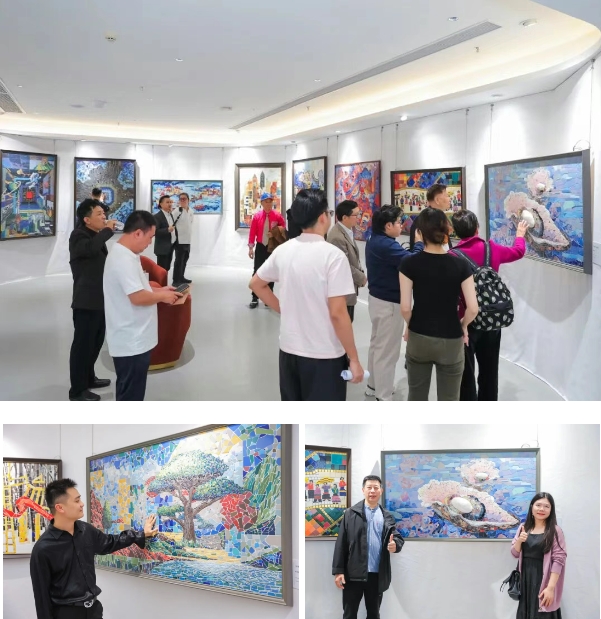 展览分为 “寰宇叙事”、“生命诗篇”、“心源意象” 三大篇章,引导观众完成一场从宏观宇宙到内在心灵的哲思旅程。作品如《解构·粤港澳建筑》抽象演绎城市肌理,《中国芯》对智能时代美学的前瞻思考,《海蓝·水母之舞》捕捉海洋生物的灵动韵律,《绽放的和谐》在几何秩序中营造花朵绽放般的视觉美感,《乘风》让静态画面有了 “动态的破碎感”,而《斗门水上婚嫁》则将国家级非遗转化为细腻的镶嵌画面,展现了艺术对本土文化的深切关注。