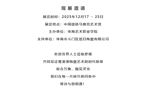 2025年12月17日下午,由国家艺术基金资助、珠海艺术职业学院主导、旭日集团(白兔瓷砖)鼎力支持的 《粤港澳陶瓷高温色釉技艺与陶瓷马赛克设计人才培训项目》作品展,在珠海市斗门区旭日陶瓷有限公司(以下简称“旭日集团”或“白兔瓷砖”)隆重开幕。本次展览以 “嵌合万象:陶瓷马赛克中的灵光碎片” 为主题,集中呈现了传统高温色釉与现代马赛克设计交融共生的艺术成果,标志着一次深度的“文化+设计+产业”实践的成功落地。