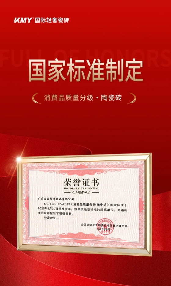近日,由KMY卡米亚瓷砖参与制定的《消费品质量分级 陶瓷砖》国家标准正式发布。作为一家拥有23年发展历程的大型陶瓷企业,KMY卡米亚国际轻奢瓷砖始终深耕技术创新与品质提升,已多次参与国家标准的制定工作,持续推动行业走向规范化、高质量的发展道路。