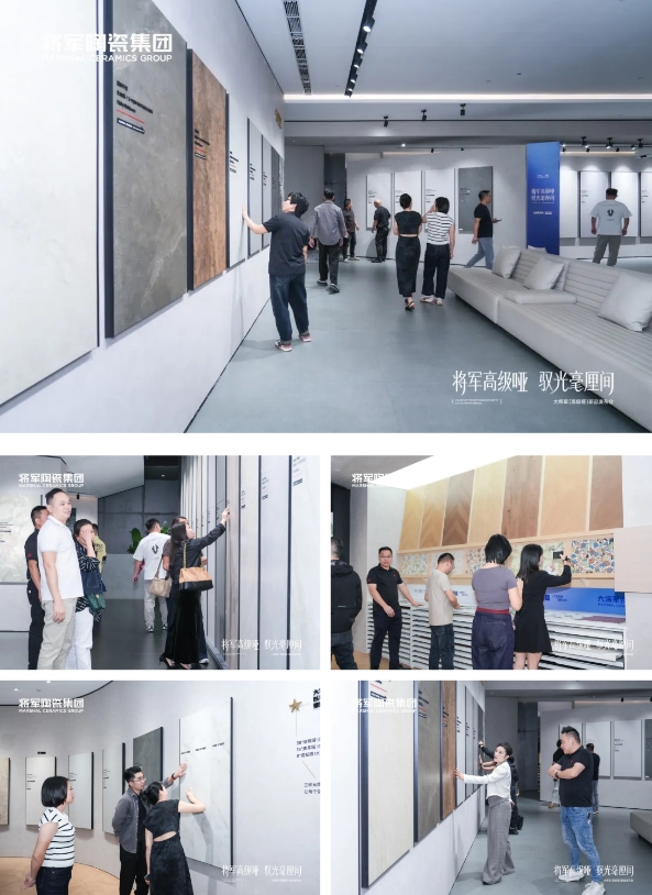 活动期间,与会嘉宾移步展厅,近距离品鉴大将军“高级哑”系列新品的非凡魅力。在光影交织的空间中,新品以温润的触感、细腻的肌理与丰富的哑光质感,诠释着“驭光毫厘间”的极致美学。合作伙伴们驻足细览,深入交流,对产品在设计创新、工艺技术与耐用性能上的全面突破给予高度评价。