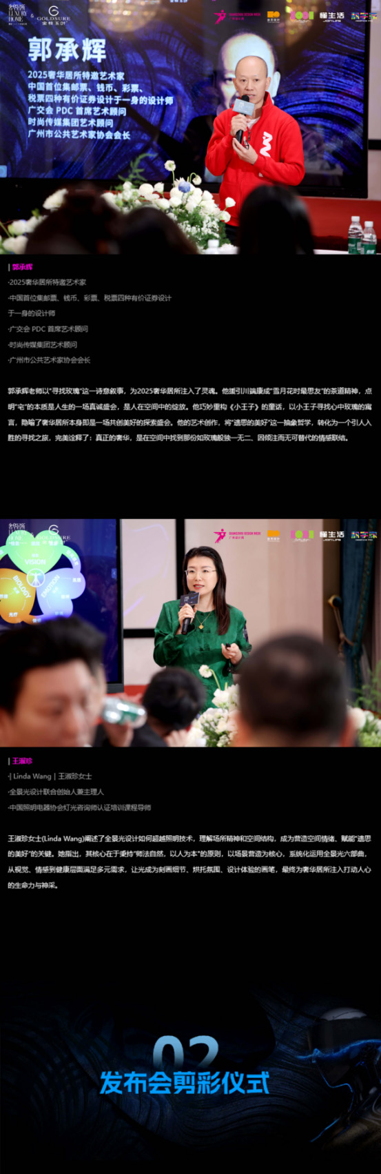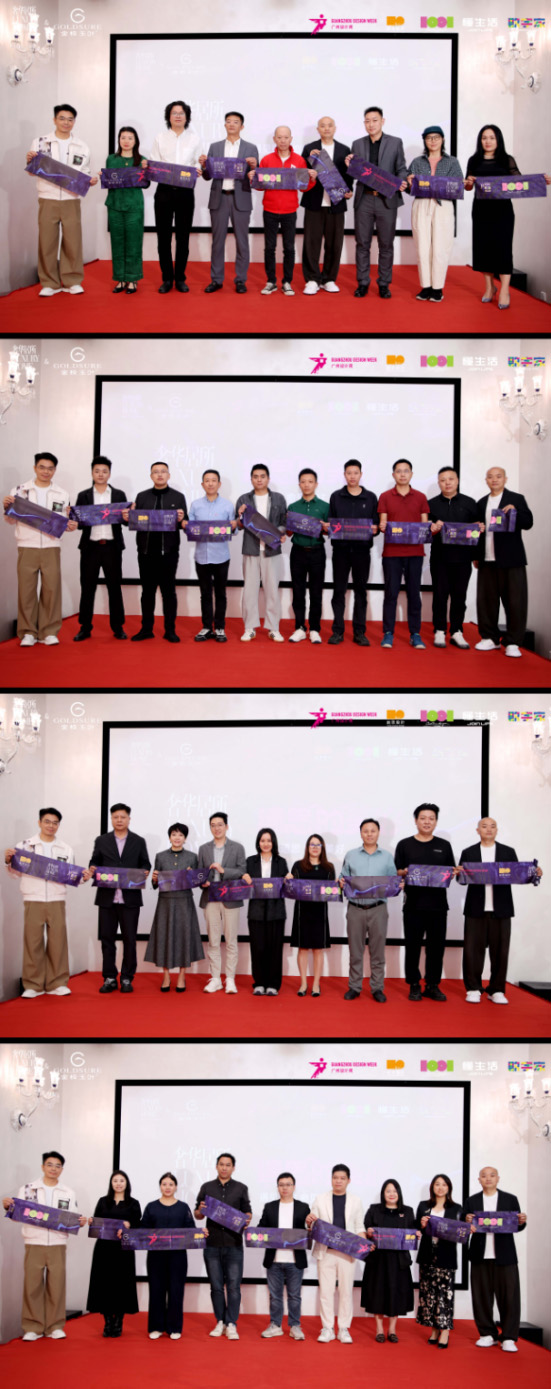 第一组剪彩嘉宾:奢华居所主策展人覃思先生,全景光设计联合创始人兼主理人Linda Wang|王淑珍女士,懂生活联合创始人、数字家首席架构师杨茗杰老师,广东省金枝玉叶灯饰董事长覃立陶先生,2025奢华居所特邀艺术家、跨界设计师郭承辉老师,广州设计周CEO贺文广先生,芬尼【董事长的房间】市场运营总监党新锐先生,美国邓恩涂料中国色彩总监Lillian Wu女士,资深媒体人、想象鹏飞文化传媒内容合伙人李可欣女士。