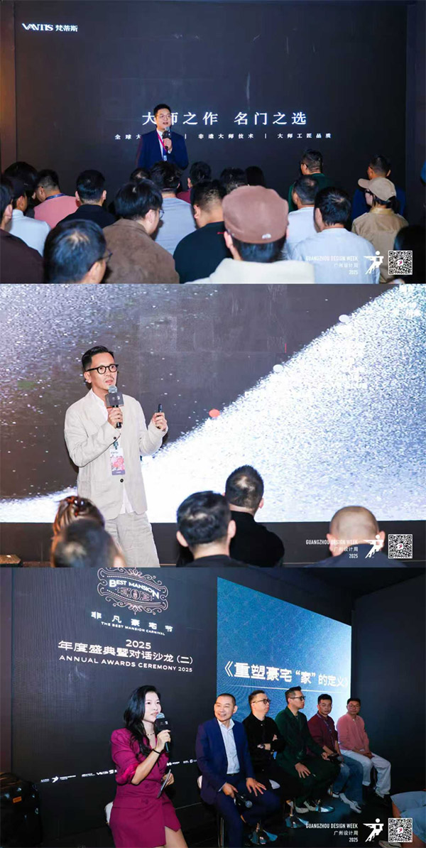 12月5日上午,广州设计周现场,「非凡豪宅节·2025年度盛典暨对话沙龙(一)」在广州保利世贸博览馆梵蒂斯展位举行。本场活动以《豪宅出海机遇探讨》为主题,聚焦中国豪宅与设计力量在全球语境中的位置与可能性,从设计实践、文化表达到产业系统,展开了一场立足现实、指向未来的深度对话。作为一项以设计视角为基点的年度观察与鉴选计划,非凡豪宅节始终关注“中国的当代豪宅”与“世界的中国豪宅”。在全球高端住宅市场结构持续变化的背景下,“出海”已不再只是市场层面的延展,而成为关于价值、文化与表达方式的重要命题。本场活动汇聚了来自设计、品牌与内容传播等多个领域的重要嘉宾,包括浙江华威家居集团有限公司总裁高丰、浙江华威家居集团有限公司渠道运营部总监叶波、浙江华威家居集团有限公司市场部总监华巧平,黎水仁佳设计公司创始人|总设计师叶永志、AXIS加拿大中轴室内设计有限公司创始人陈华京、吕爱华空间设计研究室设计总监吕爱华、UHOUSE DESIGN董事长/总设计师王小锋、LSH DESIGN 创始人/设计总监林上淮、短视频服务赛道头部博主管家小葛共同出席,构成了本场活动多维而完整的专业视角。