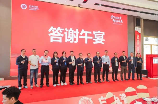 在答谢午宴上,旭日集团副总经理、珠海市白兔陶瓷有限公司总经理龚晖发表致辞,向长期以来给予支持的各方致以诚挚谢意。随后,旭日集团高层领导团队与现场来宾共同举杯,齐贺旭日集团28号窑绿色智能生产线顺利投产这一意义非凡的美好时刻。