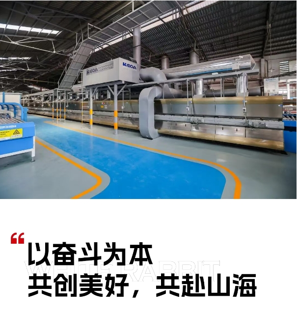 28号窑生产线及其所代表的管理体系,共同构成了旭日集团独具竞争力的综合制造优势。整线汇聚4台科达明星压机、六层干燥器、Neo-Arc系列新型窑炉、智能储砖系统、全自动抛光线及自动包装线系统等顶尖装备,实现了从压制成型到智能储运的全流程数字化闭环。产线聚焦智能化、高品质、多工艺三大核心,符合5A级别的技术标准与制造要求,日产可达15000㎡。它不仅以“余热零排放”、“智能云控”等技术树立了绿色智造典范,更通过科达智能储砖系统与码包机器人,构建了高效柔性化生产模式。这一切卓越硬件效能的发挥,植根于白兔工厂深厚的“精益内核”。公司持续推进“5S管理”与“安全意识”落地,确保生产的高度规范、整洁与安全,实现硬装备与软实力的完美融合,真正走出一条创新驱动、数字赋能的高质量发展道路。
