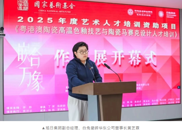 2025年12月17日下午,由国家艺术基金资助、珠海艺术职业学院主导、旭日集团(白兔瓷砖)鼎力支持的 《粤港澳陶瓷高温色釉技艺与陶瓷马赛克设计人才培训项目》作品展,在珠海市斗门区旭日陶瓷有限公司(以下简称“旭日集团”或“白兔瓷砖”)隆重开幕。本次展览以 “嵌合万象:陶瓷马赛克中的灵光碎片” 为主题,集中呈现了传统高温色釉与现代马赛克设计交融共生的艺术成果,标志着一次深度的“文化+设计+产业”实践的成功落地。