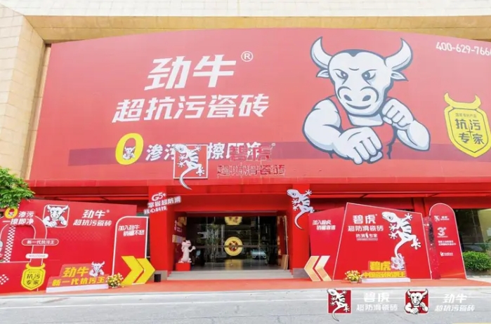 发布会上,碧虎集团重磅推出旗下第二大品牌劲牛,聚焦亿万家庭瓷砖清洁痛点,依托国家专利金盾超抗污釉料技术,打造超抗污瓷砖品牌。劲牛与深耕超防滑赛道的碧虎形成完美互补,构建起覆盖“居家安全底线+生活品质升级”的完整功能矩阵,开辟了功能瓷砖行业全新的增长空间。