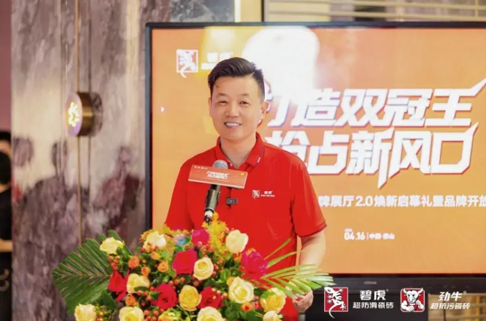 启幕仪式上,碧虎集团董事长彭天奎首先发表主题讲话,彭总表示当前陶瓷行业正处于深度变革、低价内卷的关键时期,传统经营模式难以为继,破局的关键是选对赛道、品牌与模式。他介绍,碧虎深耕超防滑瓷砖赛道多年,凭借7项国家防滑专利斩获多项行业重磅荣誉,渠道网络已覆盖全国及海外26个国家和地区。基于对387万条家居投诉数据的深度分析,彭总正式发布碧虎集团“家居安全双赛道”战略,推出拥有国家抗污发明专利的劲牛超抗污瓷砖,全力打造功能瓷砖“双冠王”。本次焕新的双品牌展厅2.0实现了体验、赋能、赛道三大核心升级,总部为经销商提供360°全周期营销帮扶。最后彭总以“顺大势,做大事;敢入局,能破局”寄语全体伙伴,未来3年集团将携手大家推动功能瓷砖行业标准化发展,重塑行业价值。