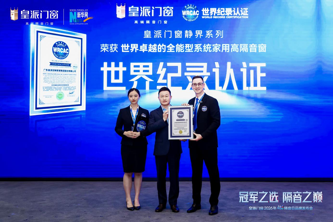 现场另一高光,来自WRCAC世界纪录认证机构。外籍与中籍认证官亲临现场,经过严苛的产品评审与工厂考察,正式官宣:皇派门窗静界系列荣获“世界卓越的全能型系统家用高隔音窗”认证。现场颁发证书,向世界证明:中国隔音门窗,完全有实力站在世界之巅!