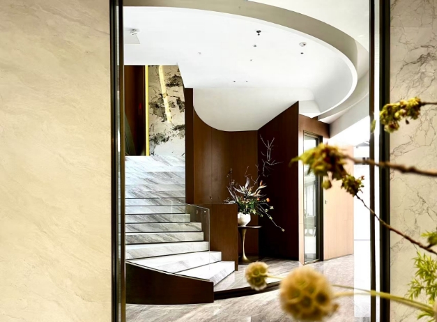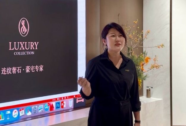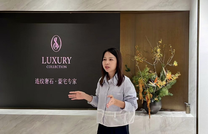 据了解,该展厅为行业内首个 1:1 还原的豪宅实景精装展厅,摒弃了传统样板间的碎片化展示模式,以真实豪宅居住场景为核心,完整呈现了庭院花园、玄关、客厅、餐厅、旋转楼梯、卫浴等全生活场景的高定解决方案。展厅内划分奢石品鉴区、场景体验区等多元功能板块,汇聚了来自巴西、意大利、伊朗等全球顶级矿脉的奢石精品,通过精准连纹技术实现纹理的无缝衔接与无限延伸,打破了传统石材拼接割裂、质感平庸的行业局限,让参观者可直观感受连纹奢石赋予空间的艺术价值与专属感。