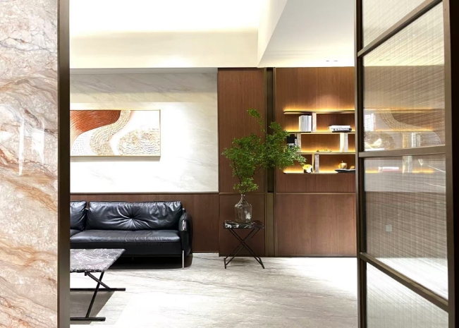 此次焕新的卡硕品牌展厅,以 “连纹奢石,打造高端人居美学” 为核心设计理念,突破了传统建材展厅以产品陈列为主的固化逻辑,将全球珍稀连纹奢石与当代空间设计深度融合,打造出集观赏、体验、定制于一体的沉浸式顶奢美学空间。